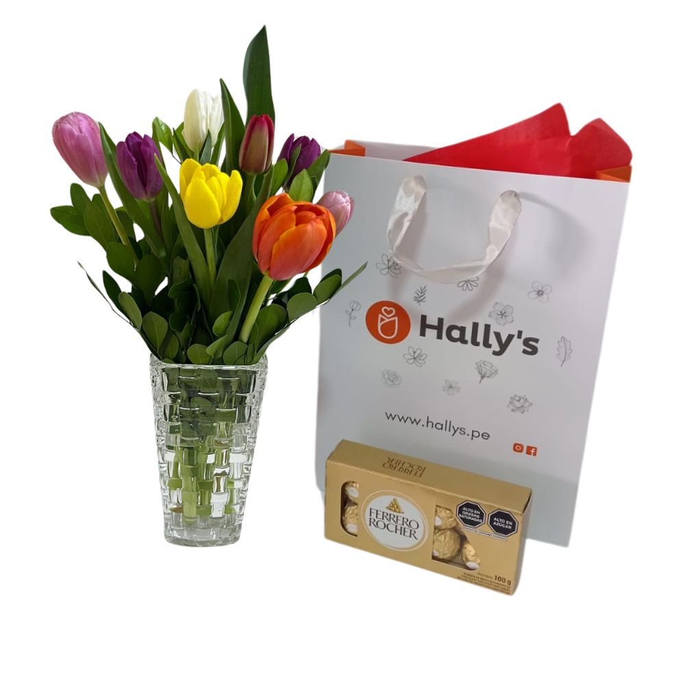 Box con 20 tulipanes de colores y chocolate ferrero -Box puede variar según stock