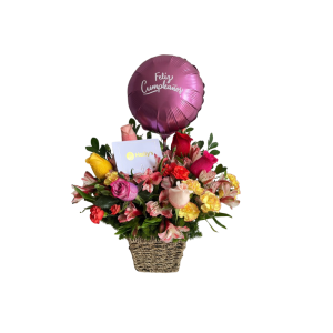 Arreglo de 10 rosas con peluche y globo corazón – Amor