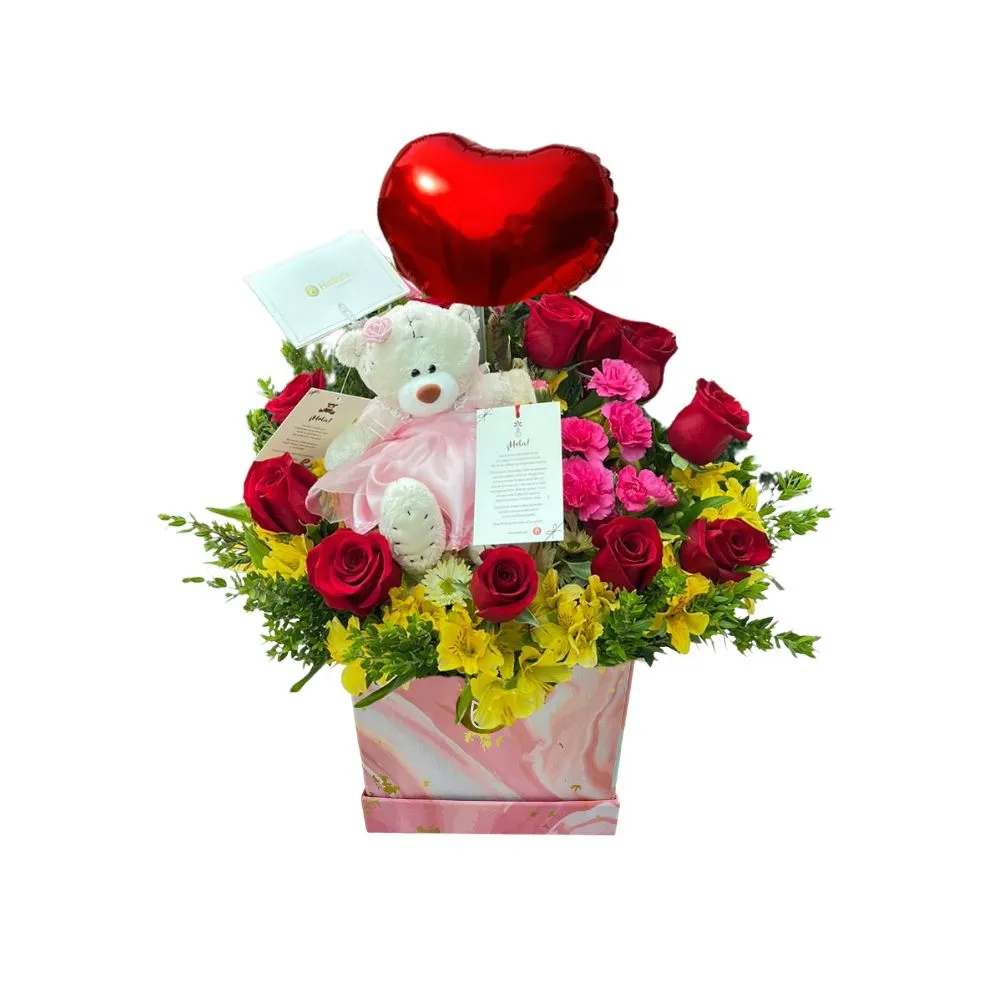 ARREGLO DE 10 ROSAS, PELUCHE Y GLOBO CORAZON