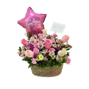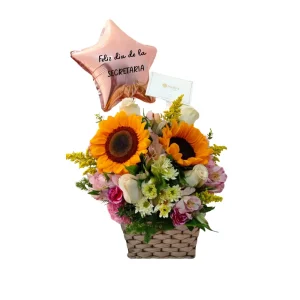 Canasta floral de 4 rosas y 2 girasoles con globo