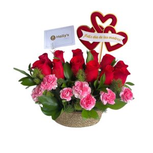 ARREGLO FLORAL DE 3 ROSAS Y 2 GIRASOLES CON CHOCOLATE