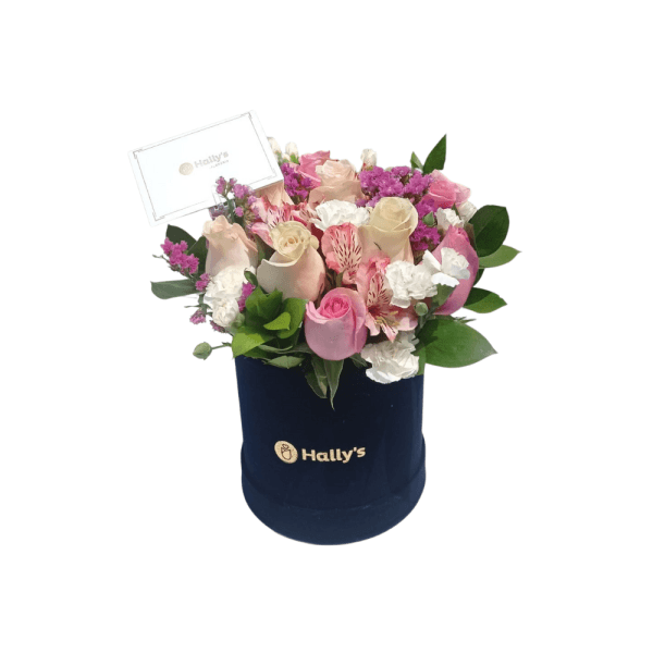 - Box circular en tela terciopelo negro o azul noche, dimensiones del box: 15cm x 15cm / el alto puede variar según el tamaño de las flores.
