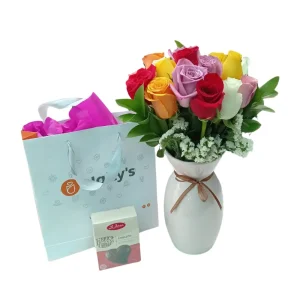 Arreglo de 10 rosas con peluche y globo corazón – Amor